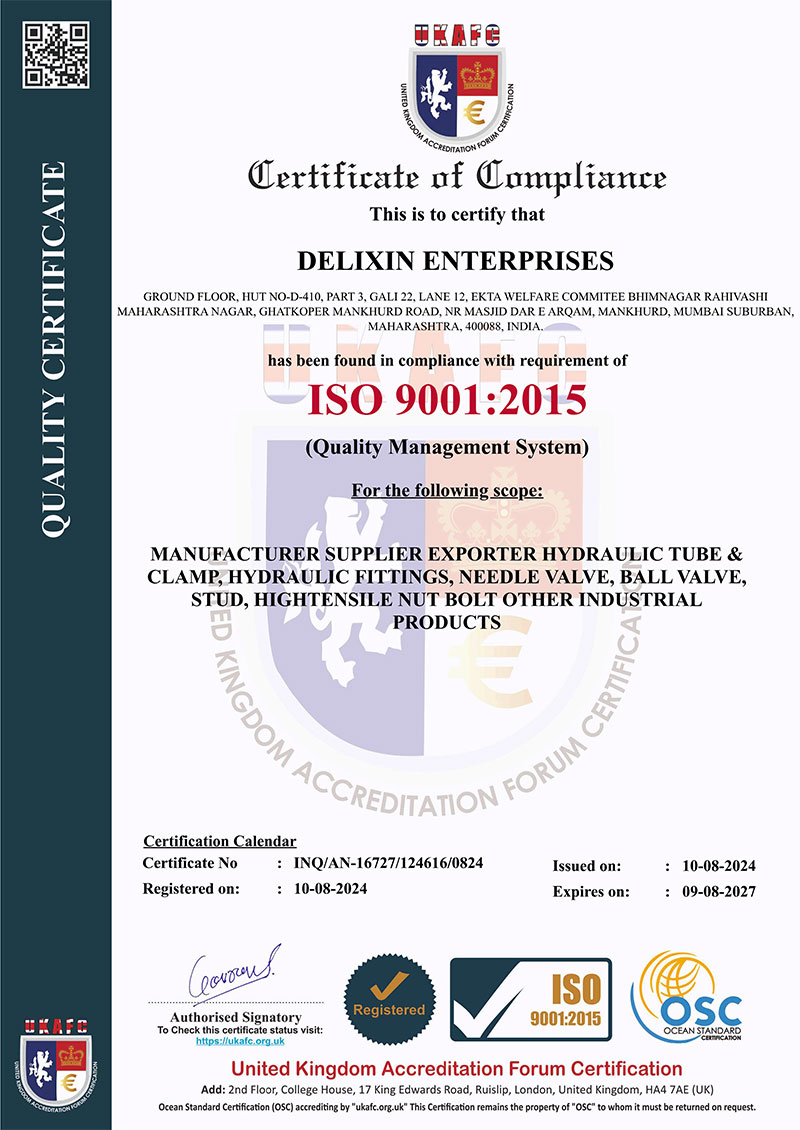 The list of valves can be categorized as: Delixin Enterprises (DE) Ball Valves, 3-Way & 2-Way Cock Valves, Safety Valves, Needle Valves, Manifold Valves, Quick Release Couplings, High-Pressure Valves, Non-Return Valves, and Strainers.In addition, DE Fittings include Compression Tube Fittings, Precision Pipe Fittings, and Hydraulic Tube Fittings.